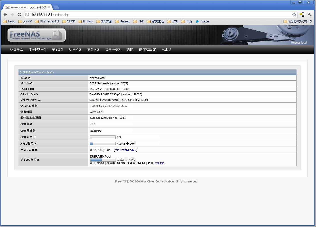 120Ei側ですが、一応RAIDアレイボード装着してますが速度などでちょっと試してみたかった事もあって、ZFSでRAID-Z設定しました。
