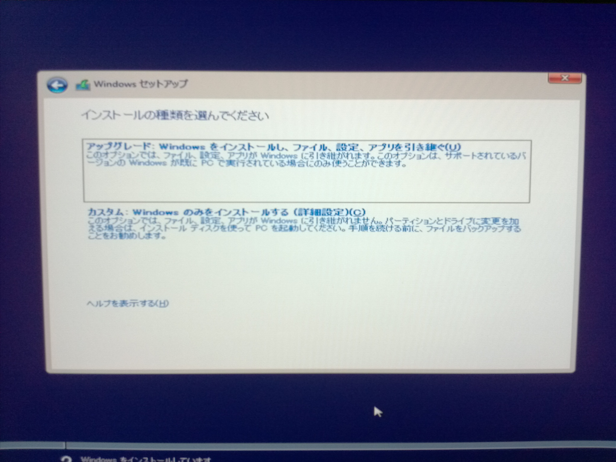 自分の場合は、下の「カスタム」で新規インストールしてます。