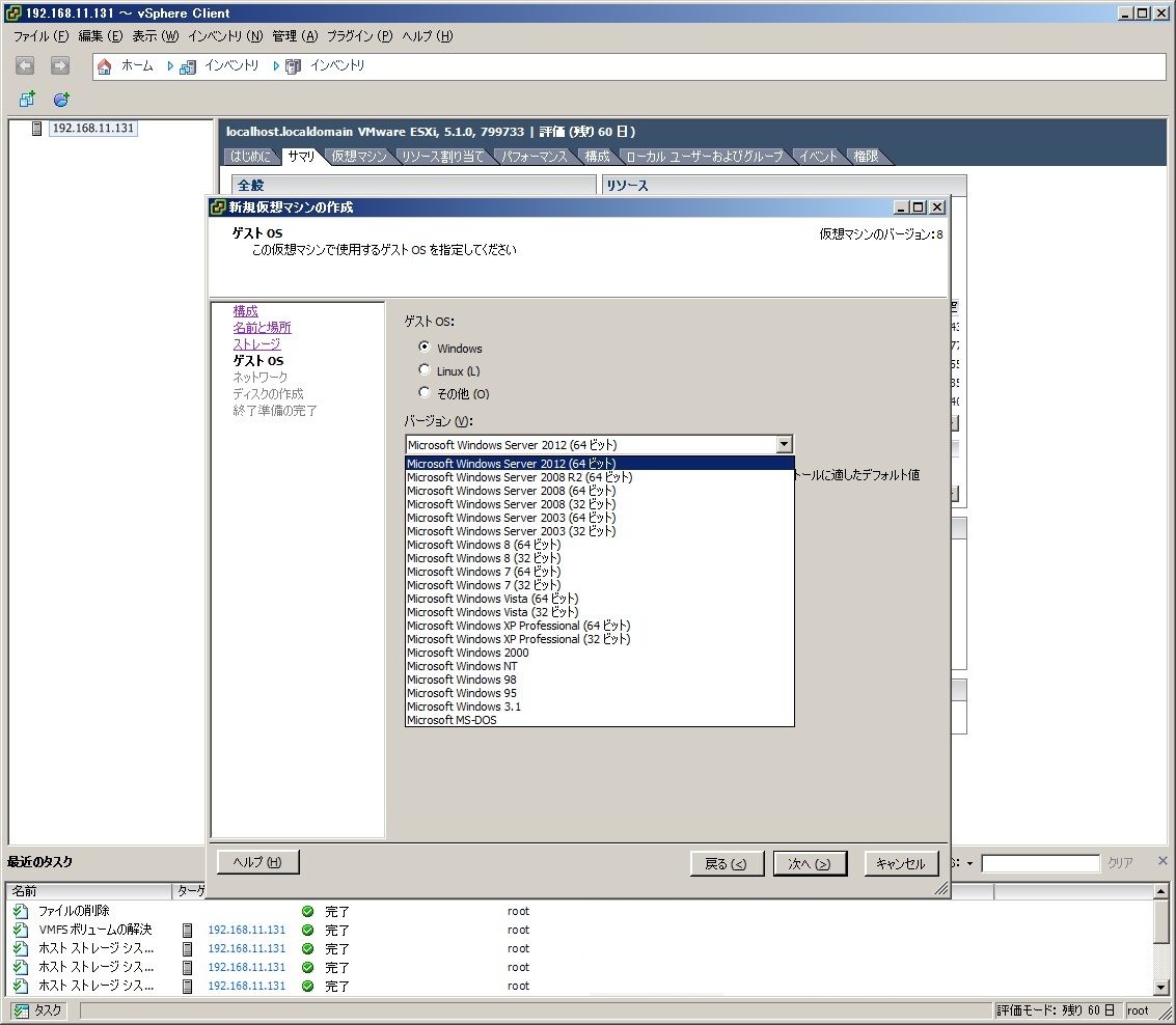 という訳でますは、VMware ESXi 5.1.0インストール後のゲストOSインストールのところから。