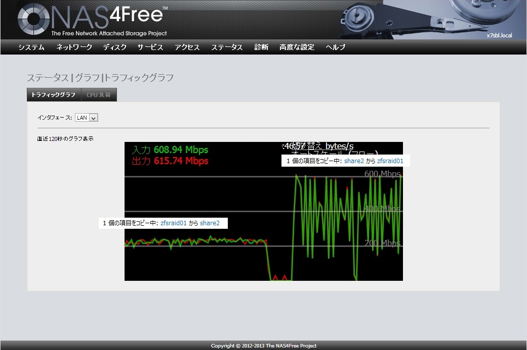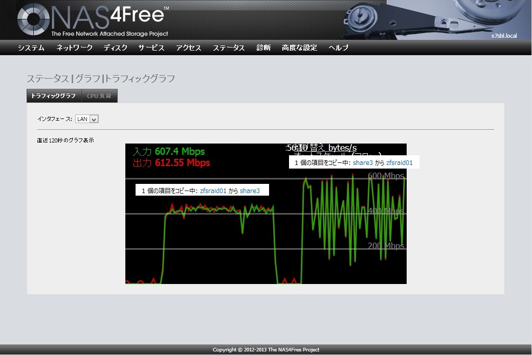 緑:PC→NAS(zfsraid01)へコピーしている時(約600Mbps)