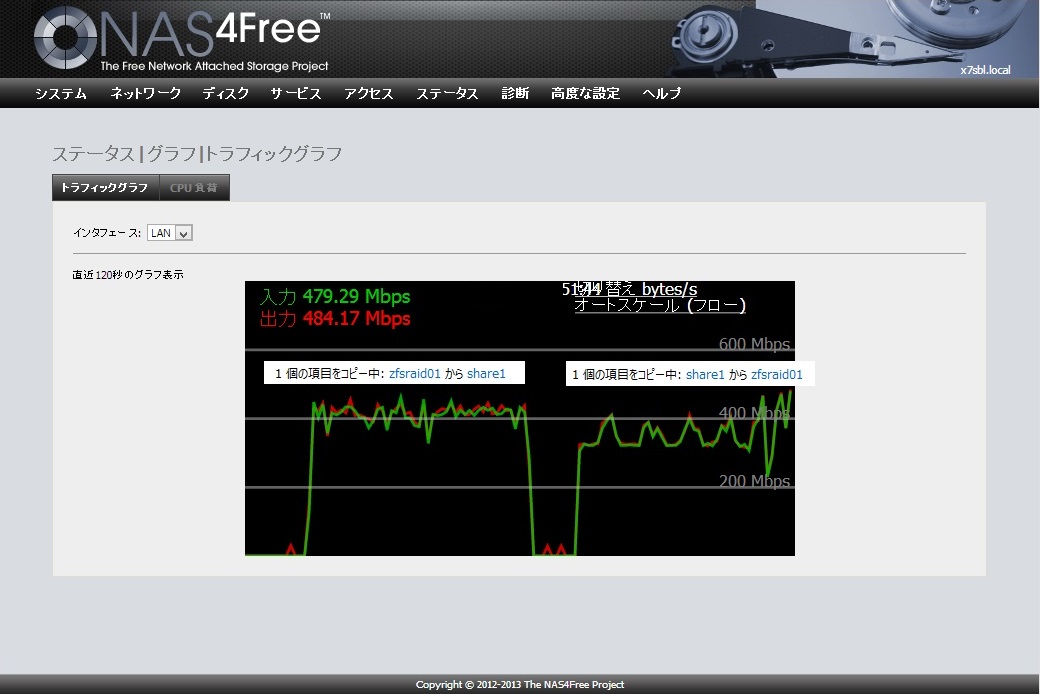 赤:NAS(zfsraid01)→PCへコピーしている時(約700Mbps)