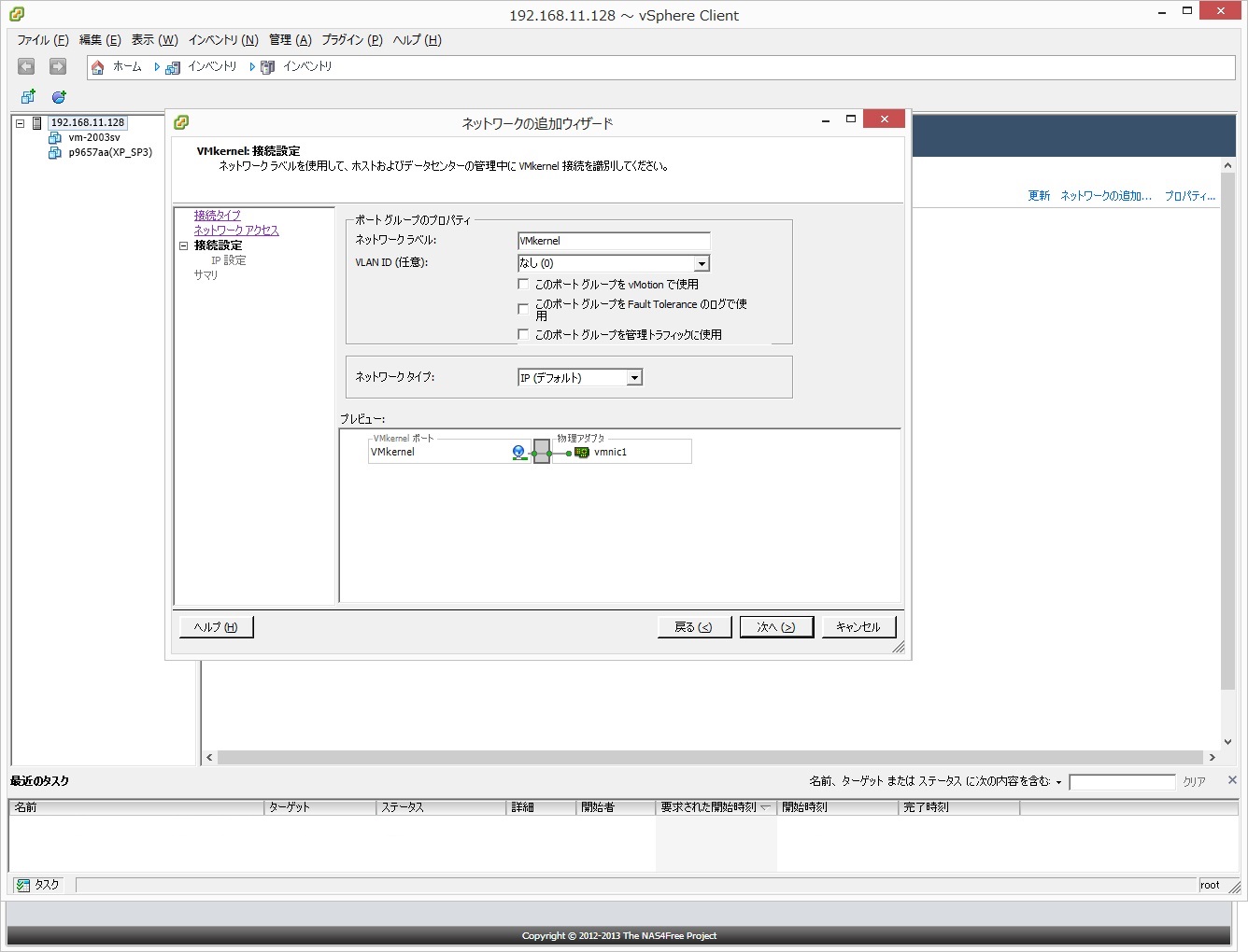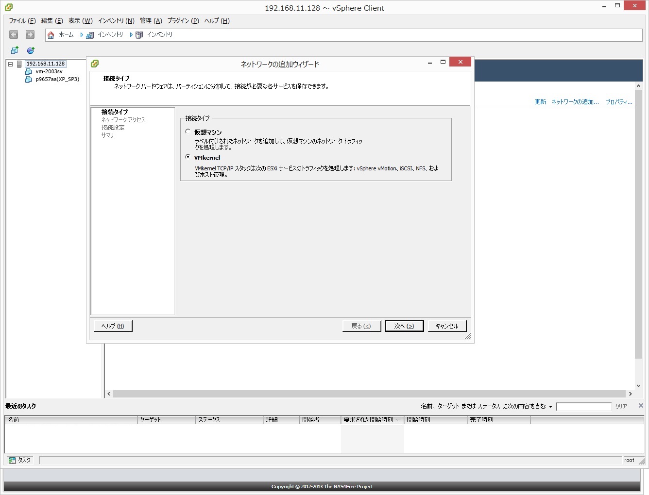 ●接続タイプで「VMkernel」を追加