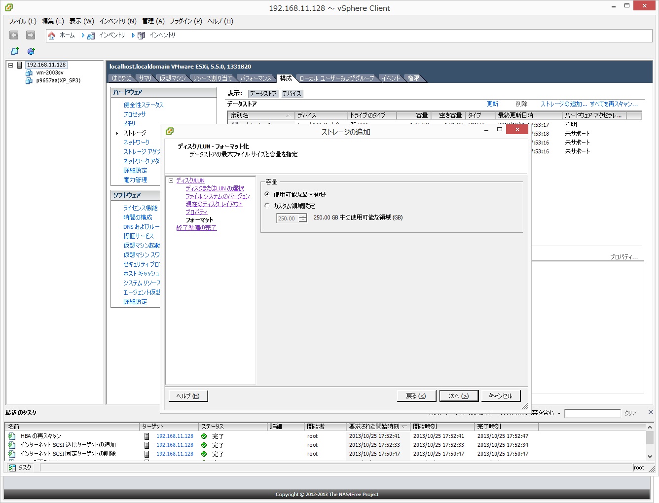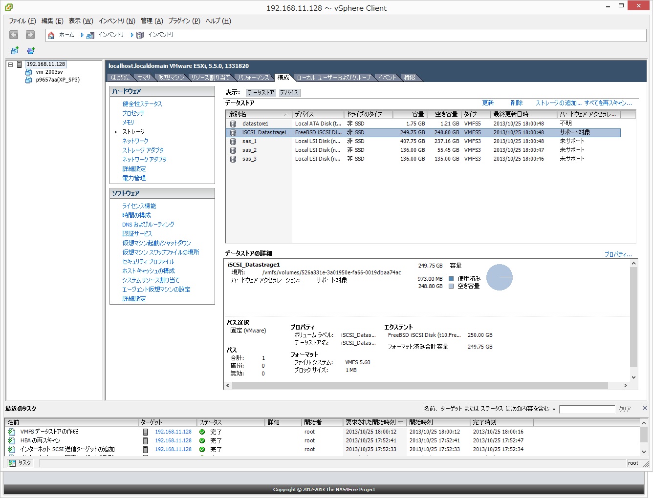 iSCSI用に250GBを割当てたのですが、最初から250GBある訳ではなさそうです。使用していくとその分が増えるみたい。これも嬉しい状況です。